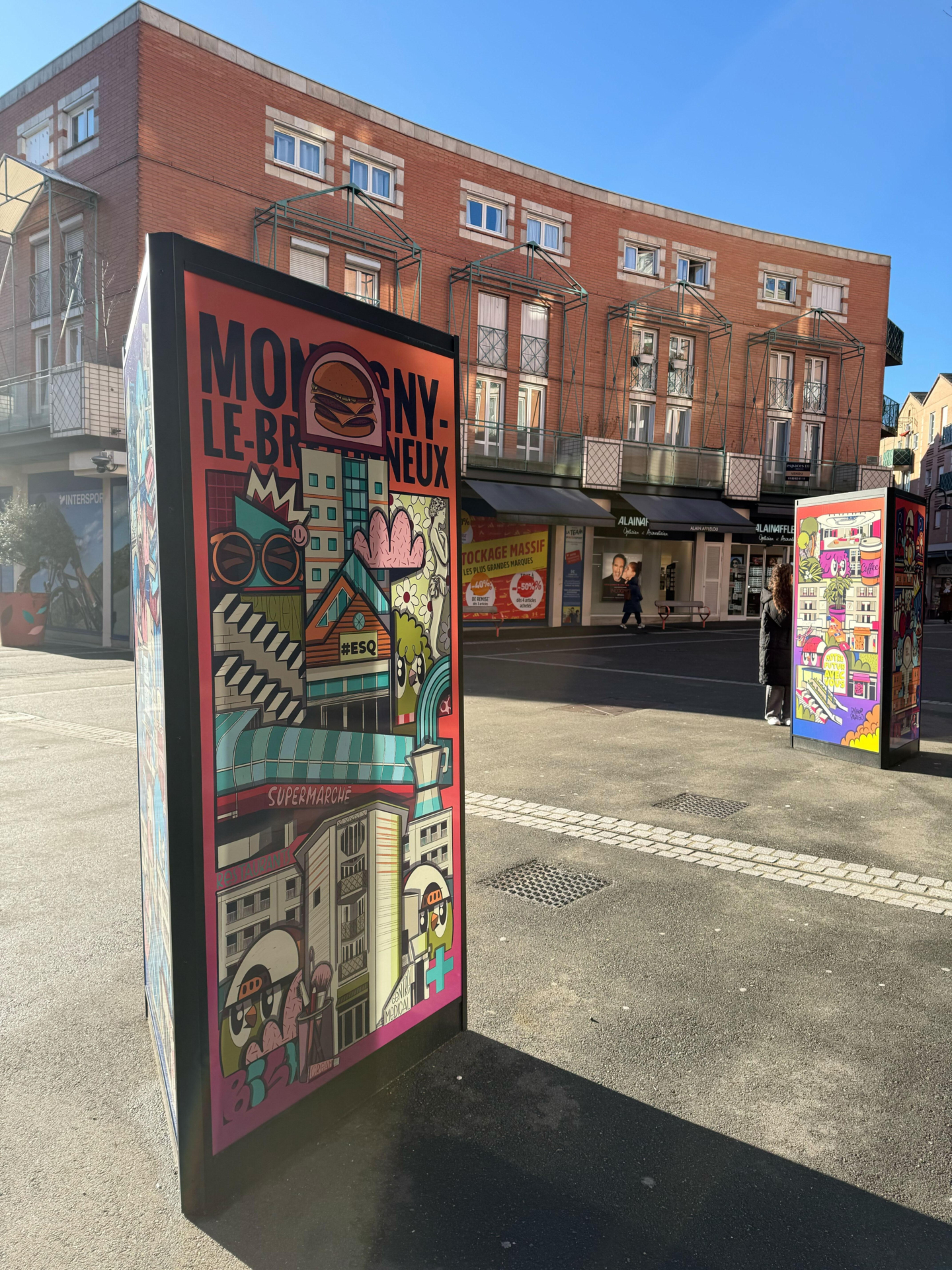 As part of this artistic production project, the artist created five original illustrations retracing the history of the shopping center, displayed on two tripod structures installed in the pedestrian street. The art installation is accompanied by a playful activity: a contest inviting visitors to spot the hidden details in the works, thereby enhancing the customer experience and the connection between the venue and its audience